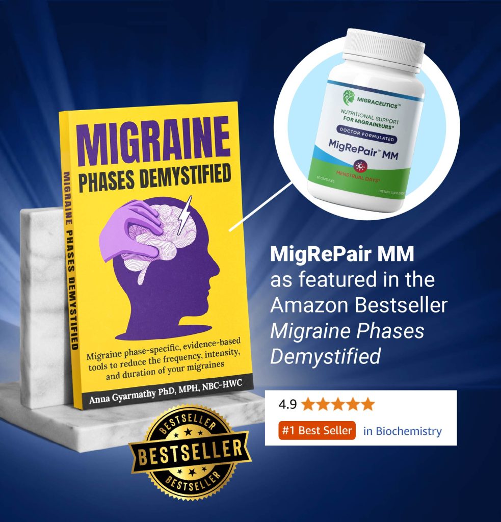 Migraceutics is a patent pending, holistic, natural product line formulated by a doctor based on decades of biomedical research and clinical trials with real migraine patients. Migraceutics provide migraine phase-specific and threshold strengthening targeted support. Our formulas acknowledge the phases of migraine: the ictal/migraine phase (premonitory, headache, postdrome, and aura stages), and the interictal phase; and that migraine is a sensitivity threshold disease. Migraceutics – MigRePair MM was specifically designed by women for women. This unique formula combines feverfew with Pinus pinaster (pine bark), grape seed extract, ginger extract, and white willow bark extract to provide powerful herbal support during the sensitive days surrounding your menstrual cycle – from Day 21 of your current cycle through Day 5 of your next cycle.