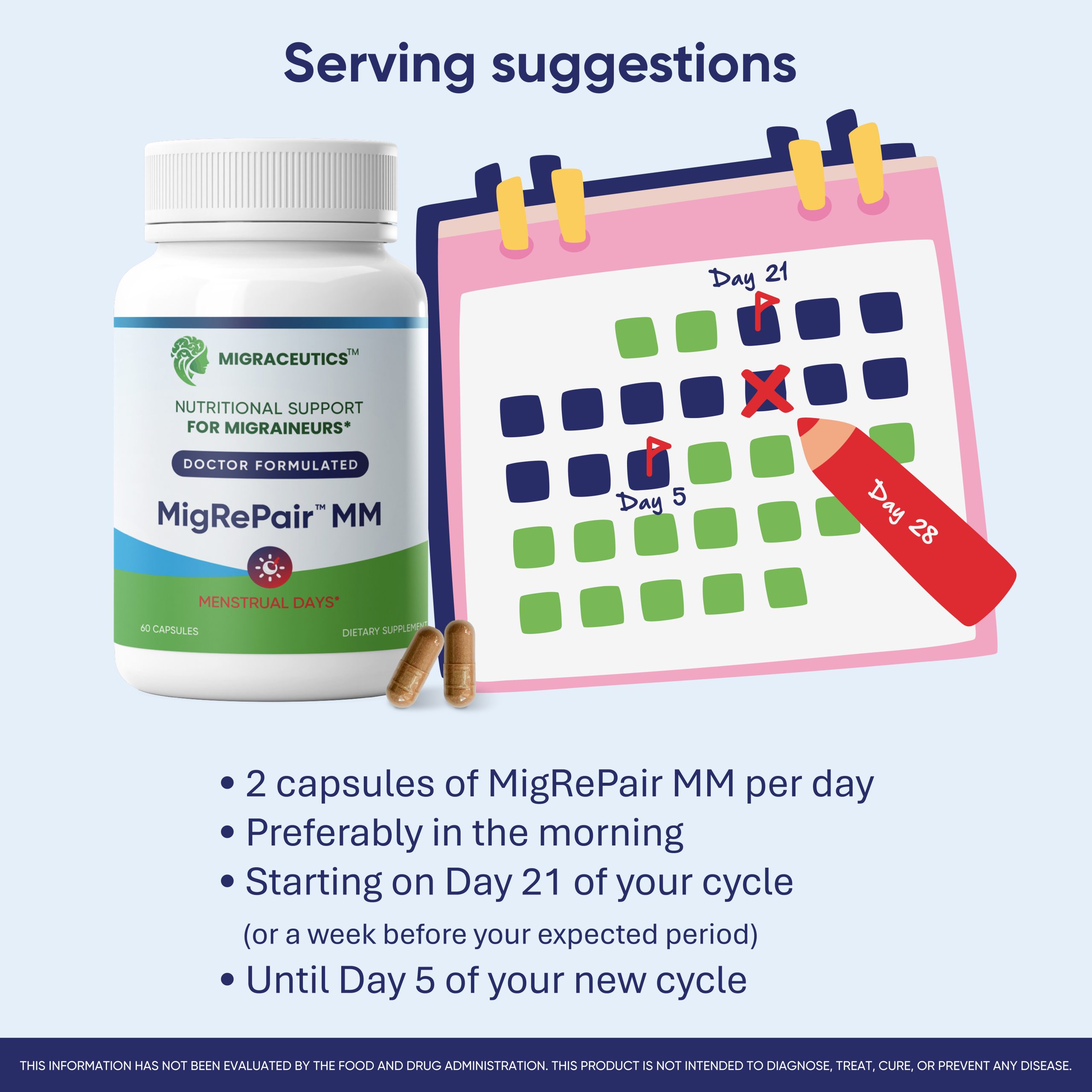 Designed by women for women to support migraine health related to menstrual migraine and menstrual inflammation. Take two (2) capsules daily, preferably in the morning with a meal, starting on Day 21 of your current cycle until Day 5 of your new cycle, as a dietary supplement or as recommended by your healthcare professional.