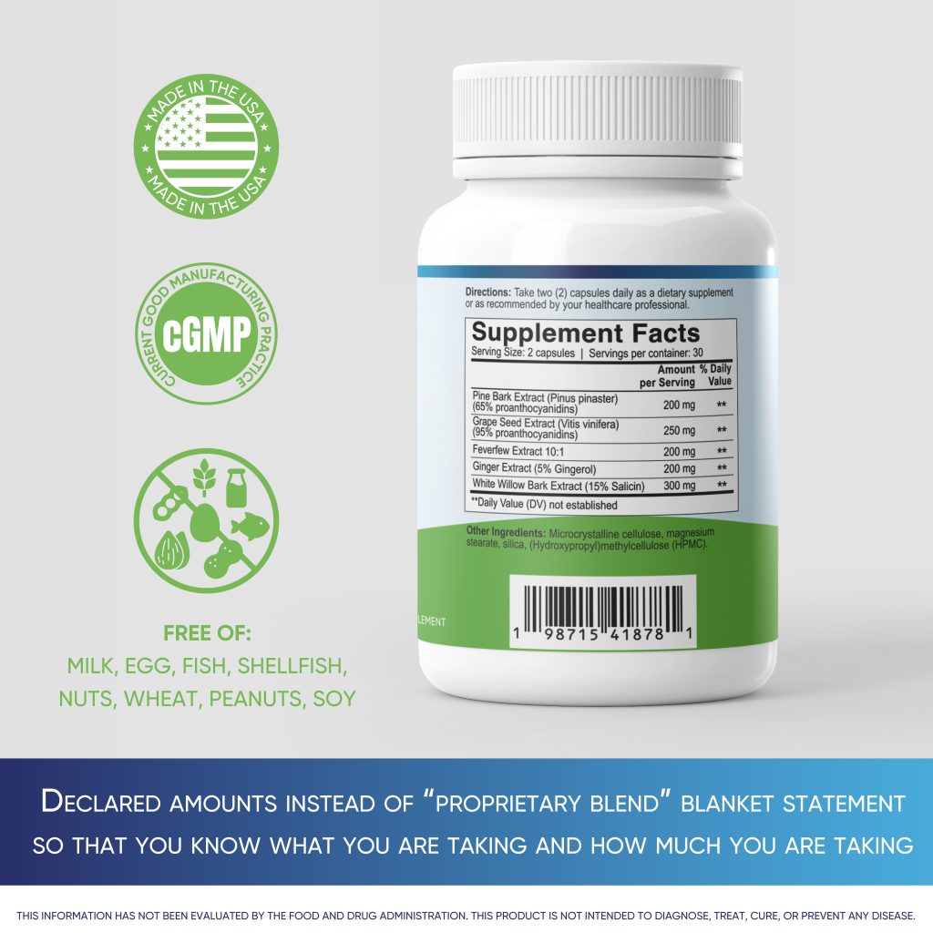 Feverfew, White Willow Bark, Ginger, Pine Bark, Grape Seed Extract